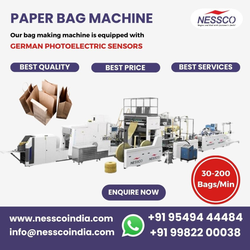 Looking for the top paper bag machine manufacturer in Saudi Arabia? Nessco offer high-quality, durable, and efficient paper bag making machines for all your paper bag production needs. With cutting-edge technology and reliable customer support, our machines help you enhance productivity and sustainability in packaging. Contact us today for better deals.
